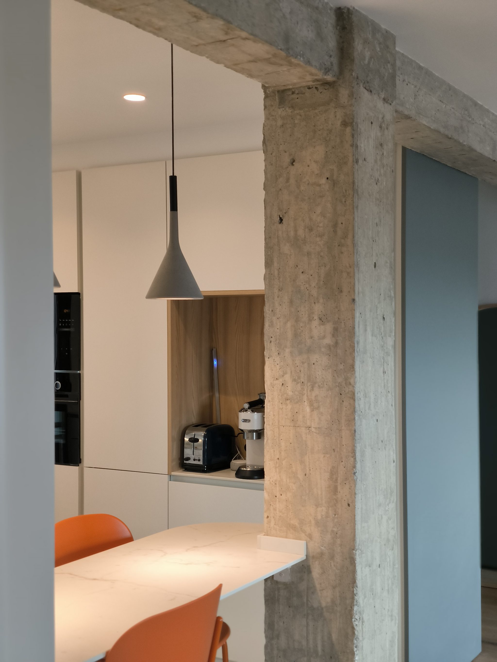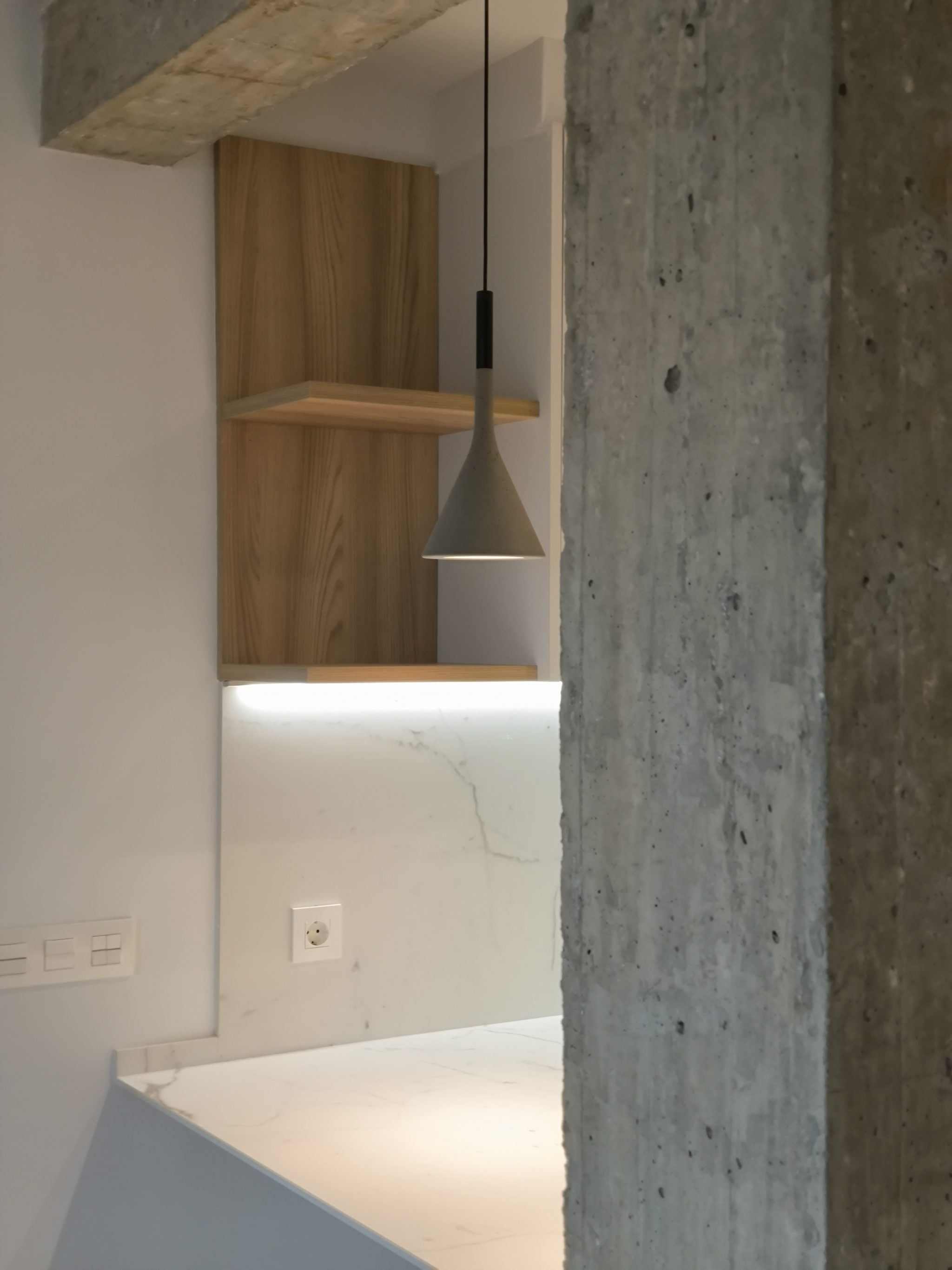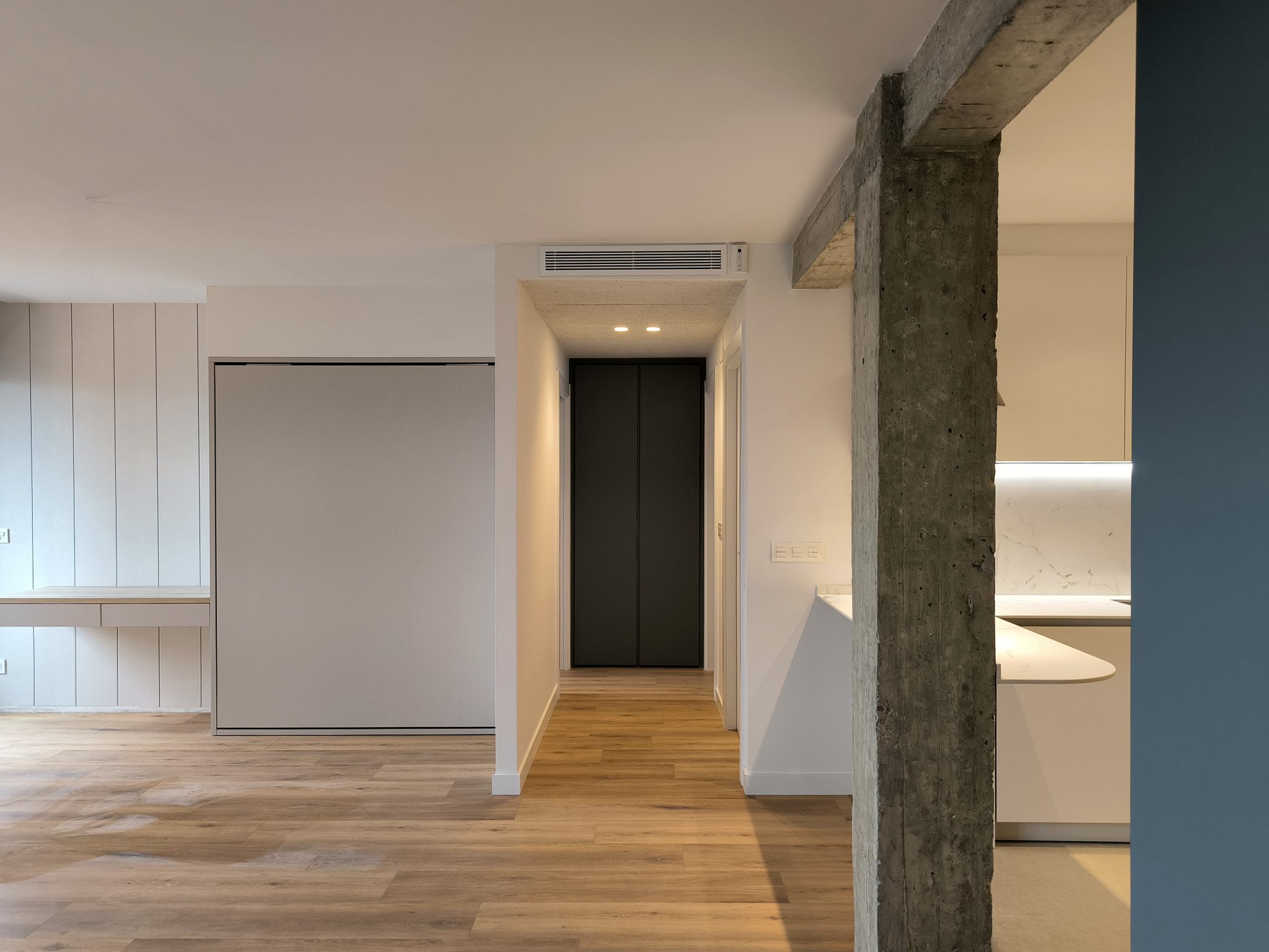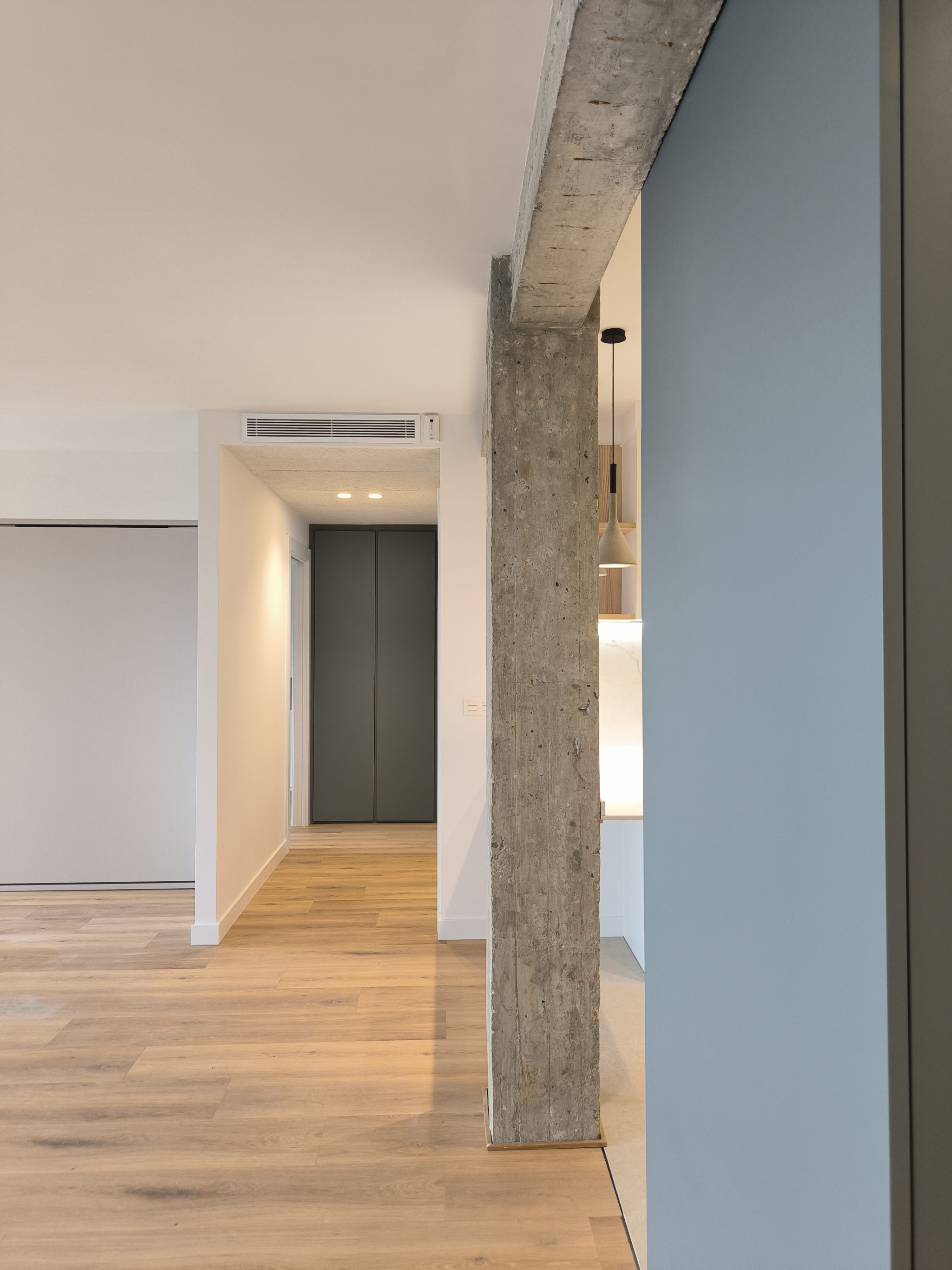 Las piezas de hormigón visto se mantienen y se ponen en valor como testimonio material del edificio original, dialogando con nuevos planos neutros y superficies cálidas. La vivienda se articula en torno a una zona de día abierta, donde cocina, comedor y estar se relacionan de manera fluida, mientras que la zona privada se ordena a través de un eje claro y limpio que estructura dormitorios y baño.