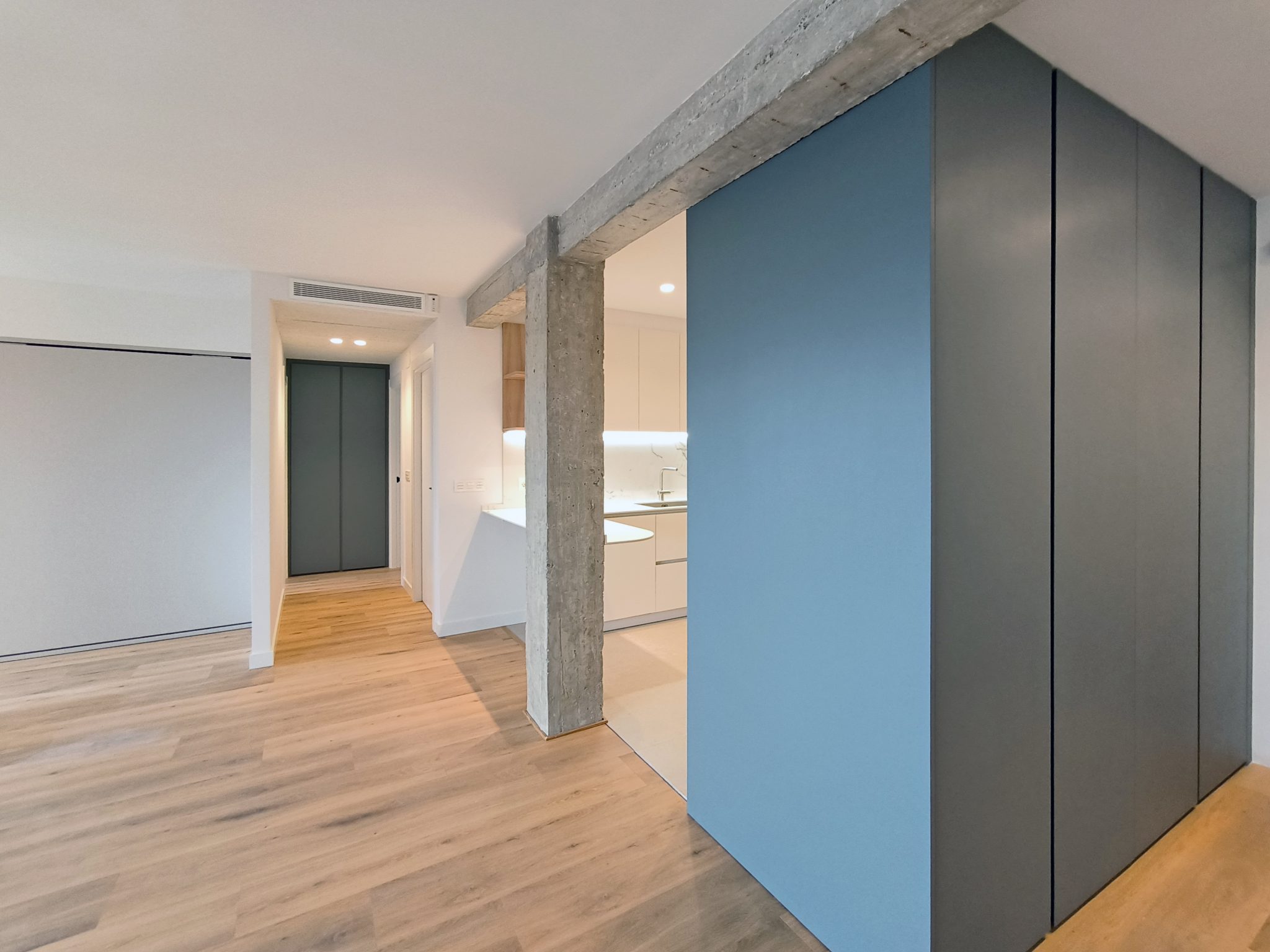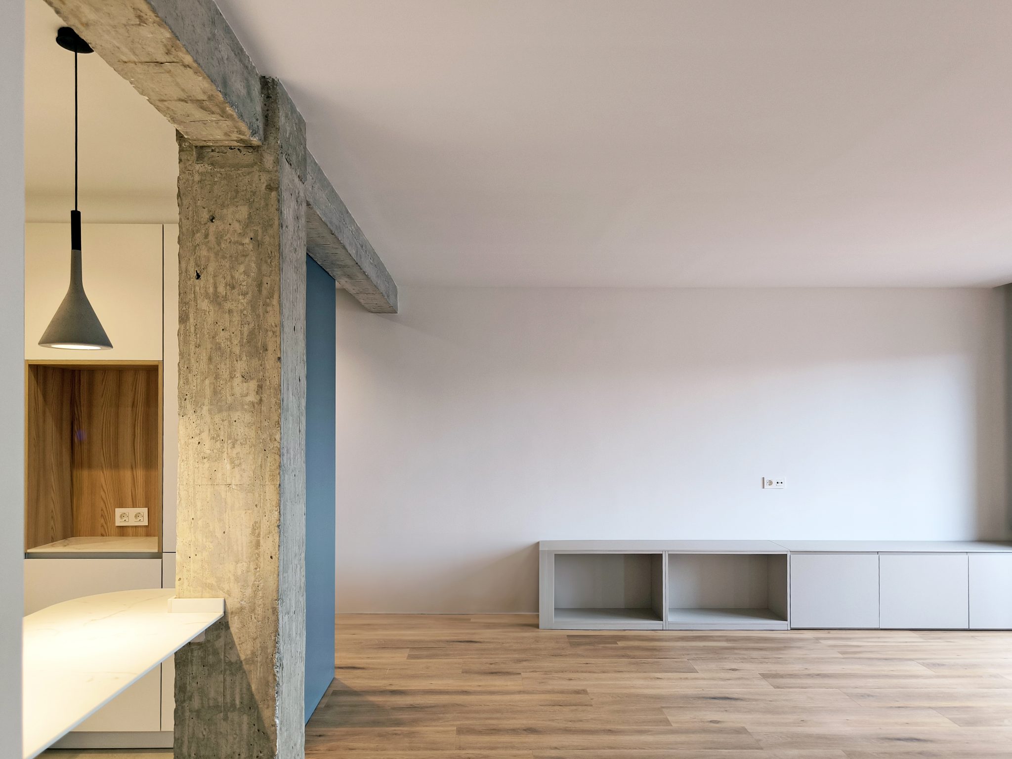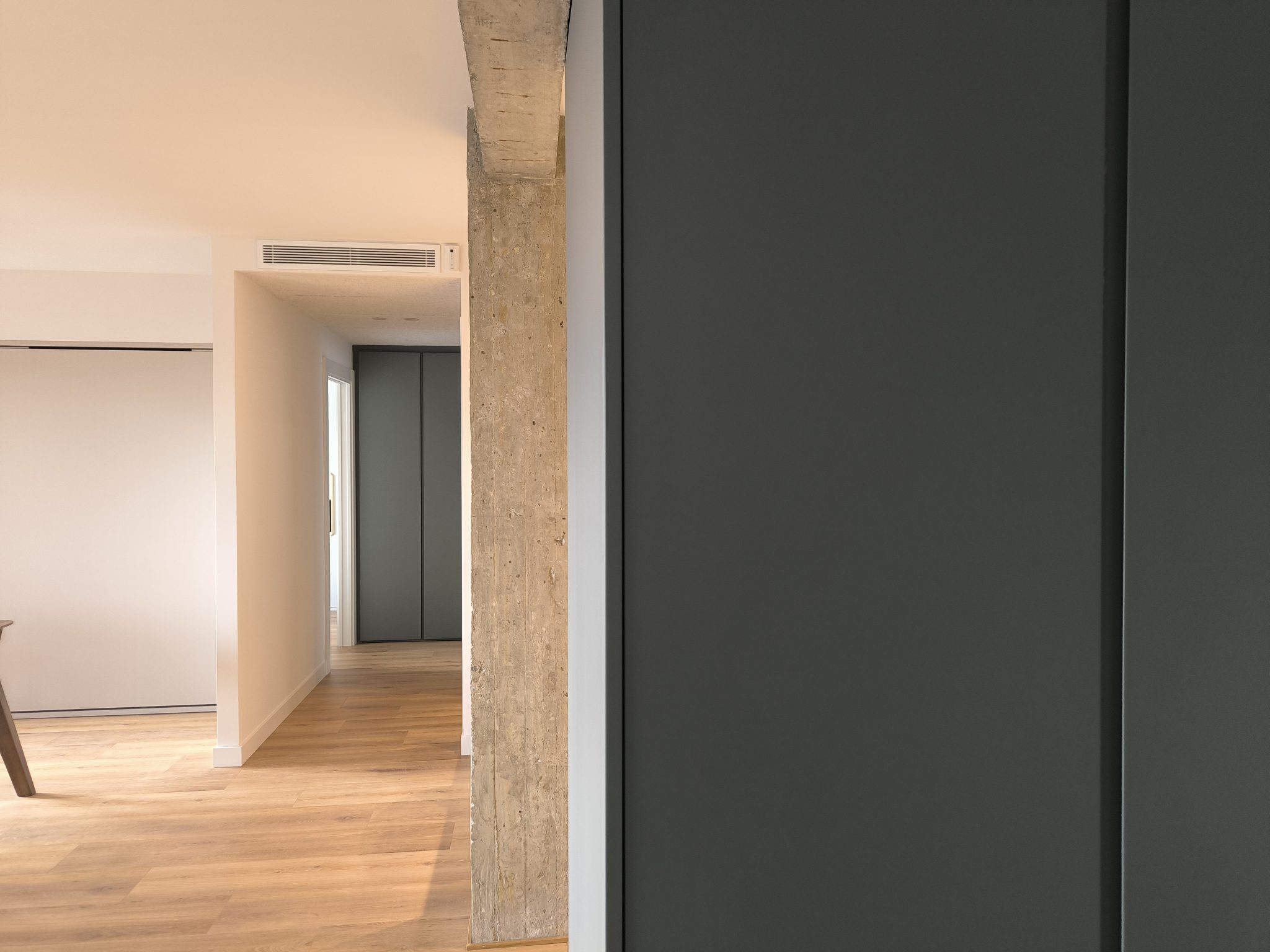Las piezas de hormigón visto se mantienen y se ponen en valor como testimonio material del edificio original, dialogando con nuevos planos neutros y superficies cálidas. La vivienda se articula en torno a una zona de día abierta, donde cocina, comedor y estar se relacionan de manera fluida, mientras que la zona privada se ordena a través de un eje claro y limpio que estructura dormitorios y baño.