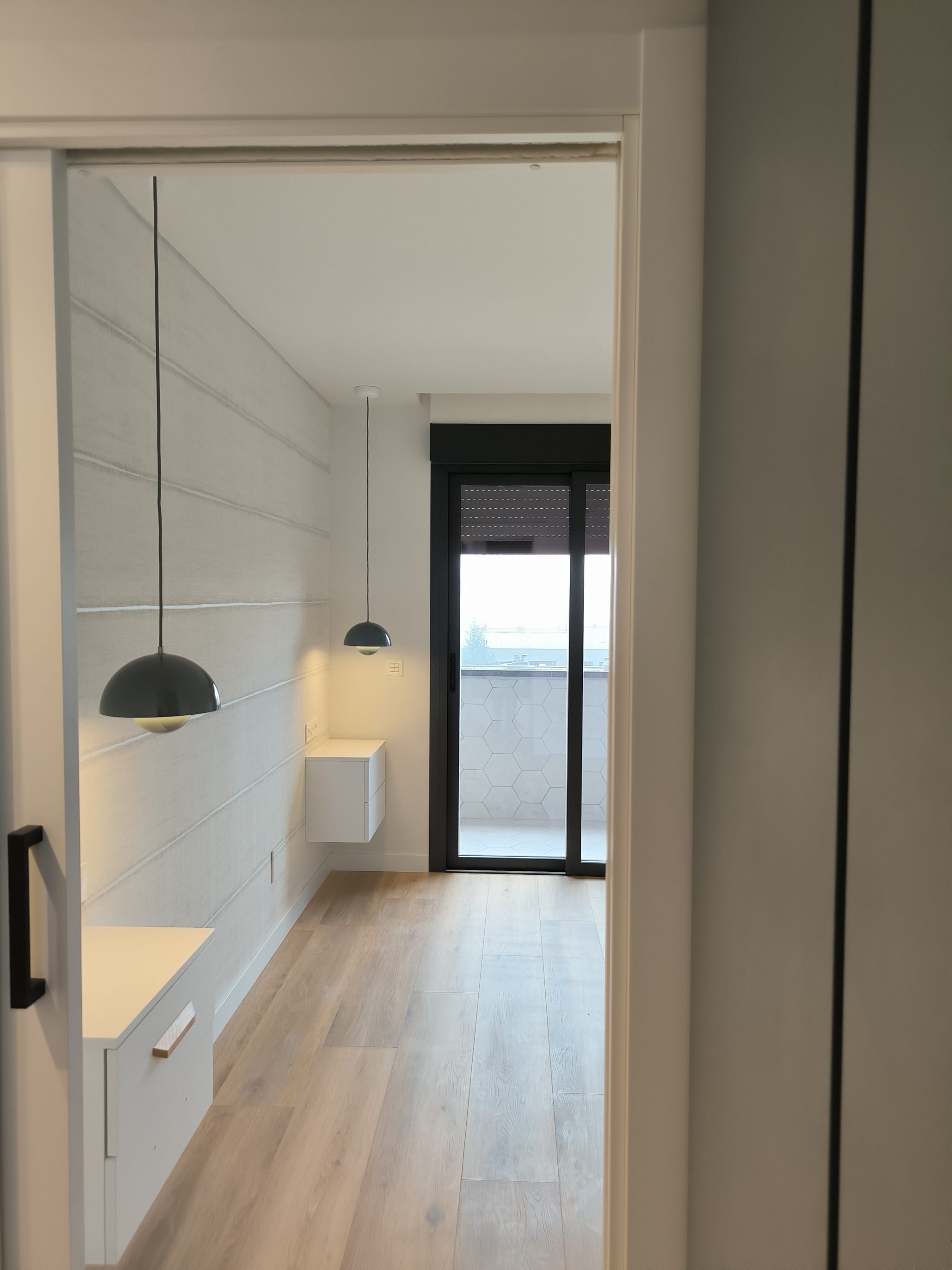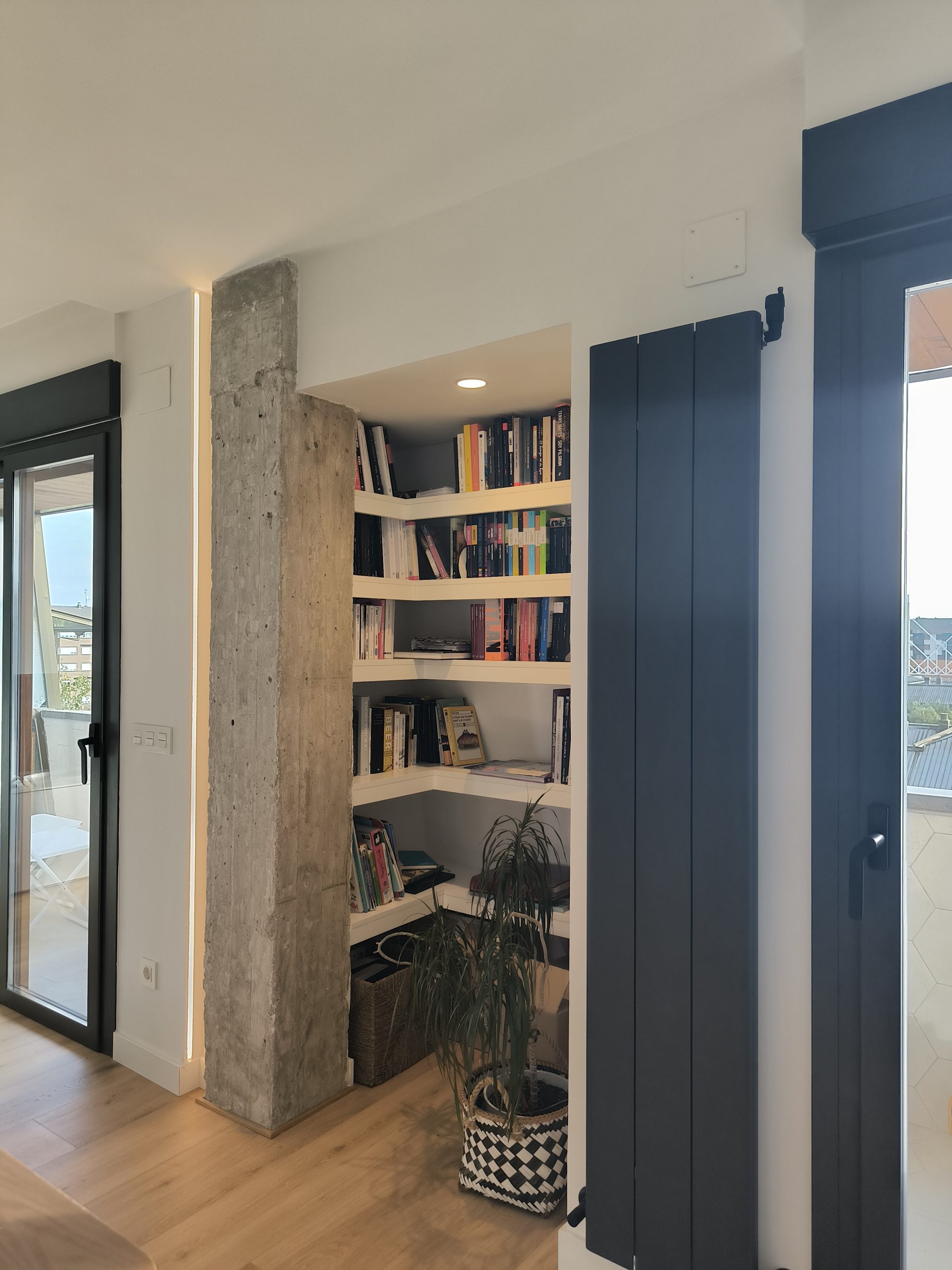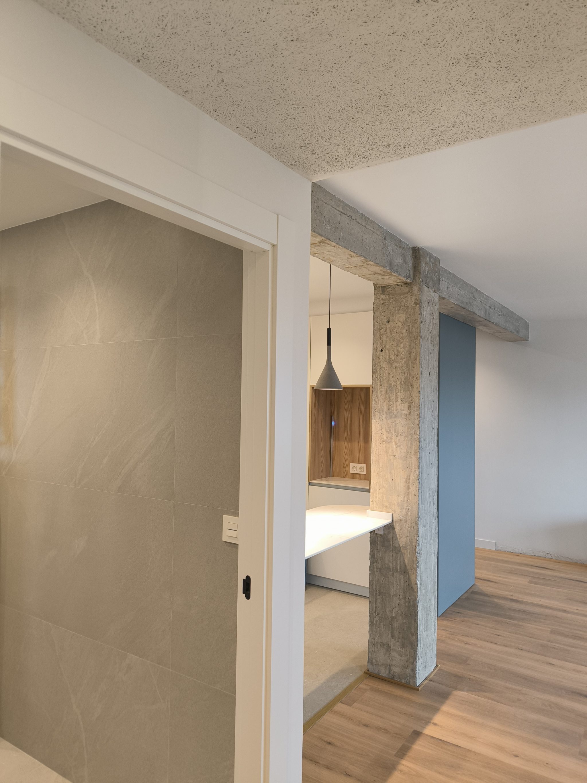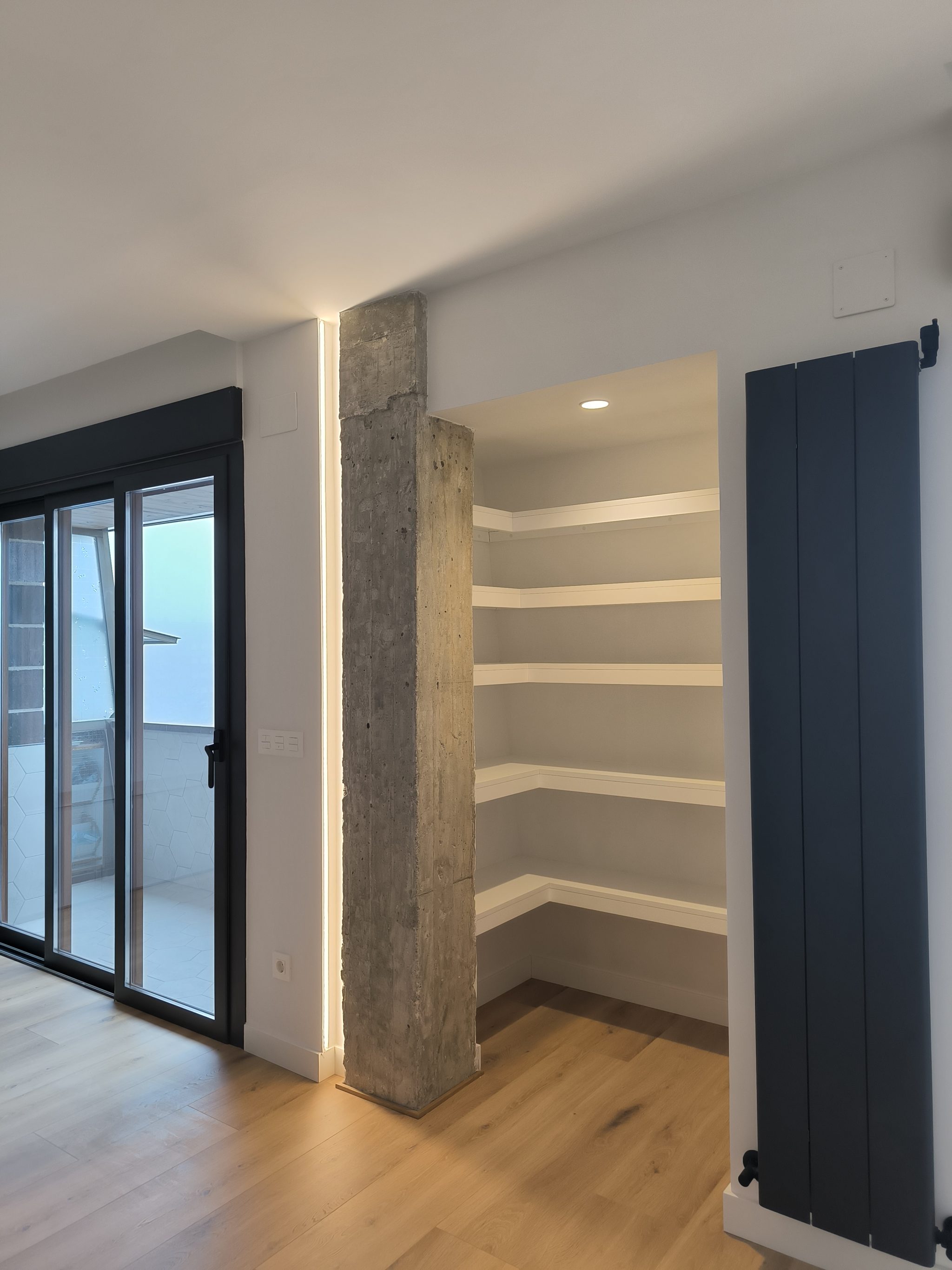 Las piezas de hormigón visto se mantienen y se ponen en valor como testimonio material del edificio original, dialogando con nuevos planos neutros y superficies cálidas. La vivienda se articula en torno a una zona de día abierta, donde cocina, comedor y estar se relacionan de manera fluida, mientras que la zona privada se ordena a través de un eje claro y limpio que estructura dormitorios y baño.