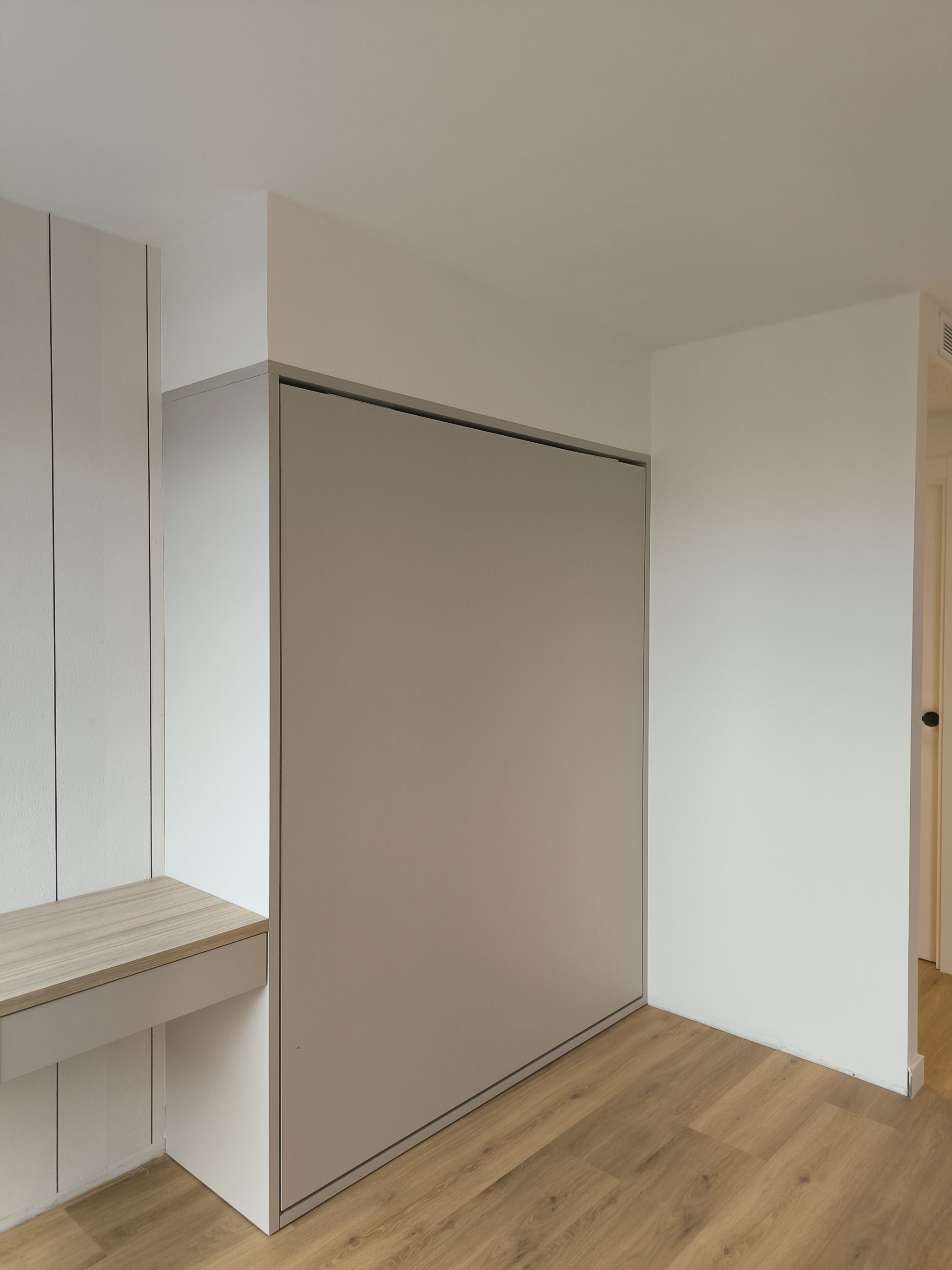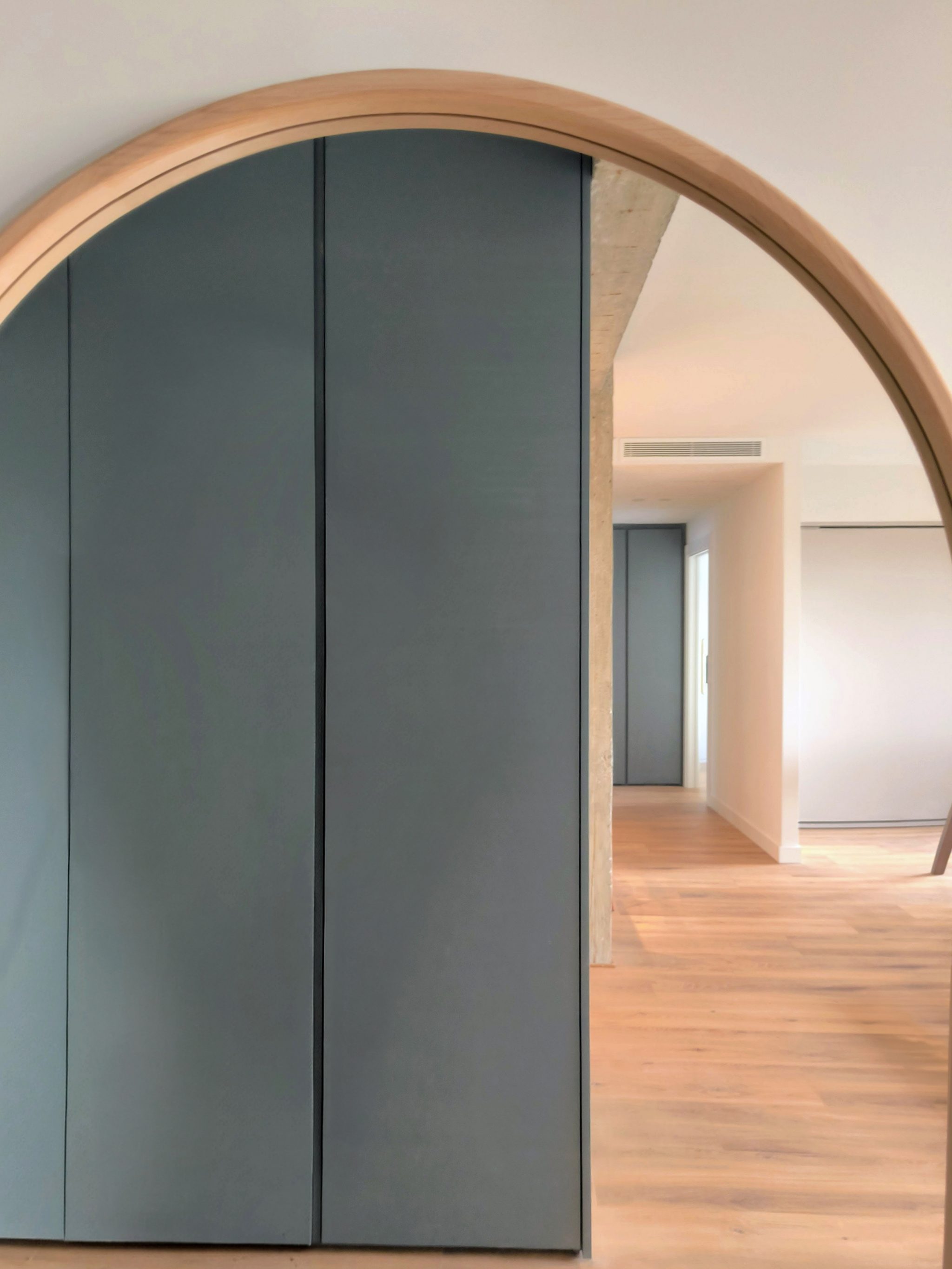 La materialidad responde a un criterio de equilibrio y honestidad: pavimento continuo en madera natural que unifica las estancias, carpinterías a medida que integran almacenaje sin sobrecargar el espacio, iluminación indirecta que enfatiza volúmenes y texturas, y una paleta cromática sobria donde los tonos neutros se combinan con acentos en azul grisáceo para aportar carácter sin estridencias.