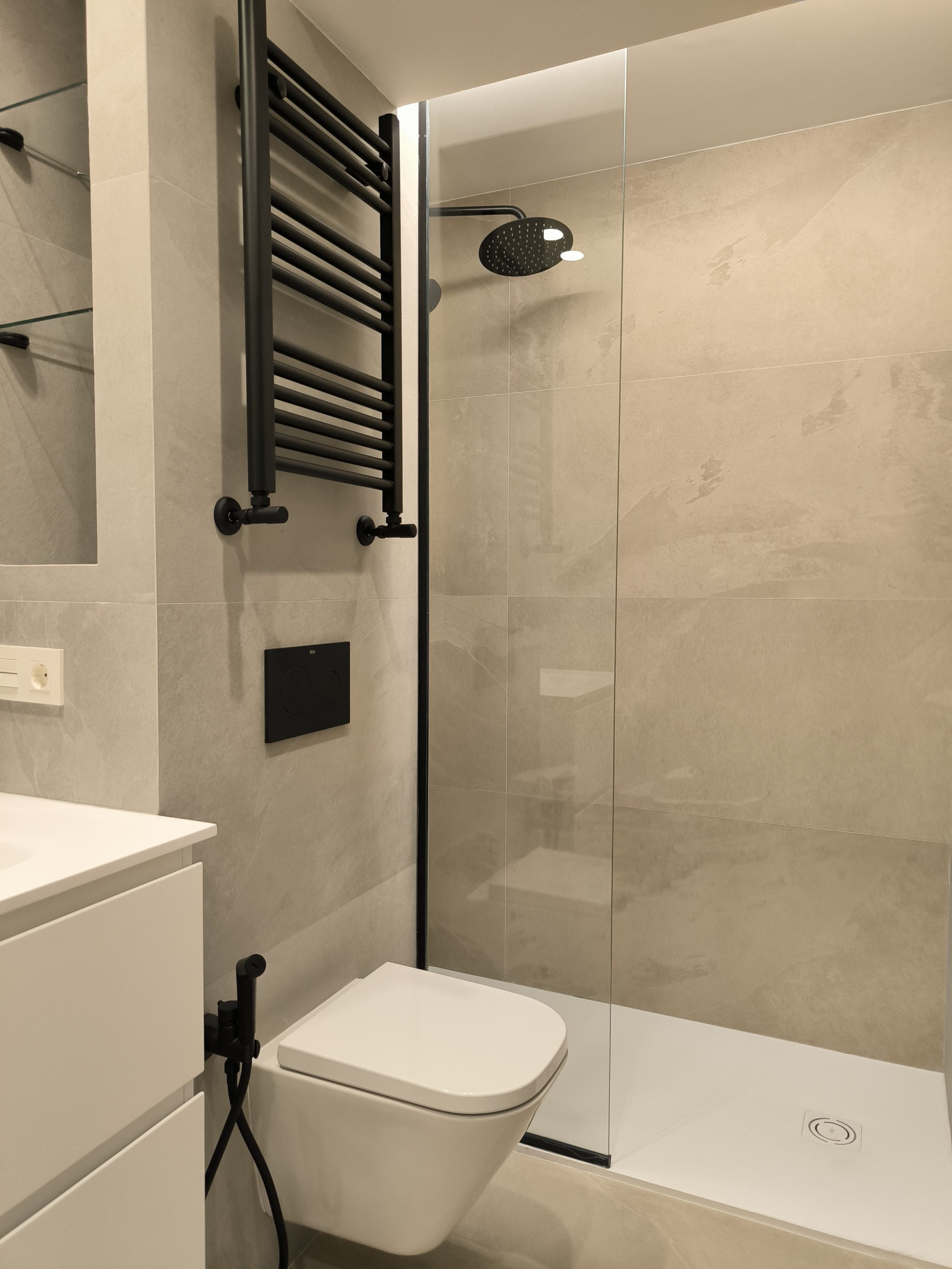 El baño se resuelve con superficies minerales de gran formato, líneas limpias y herrajes en negro que refuerzan la precisión del conjunto. La iluminación y el diseño del mobiliario fijo están pensados para generar profundidad, orden y calidez.