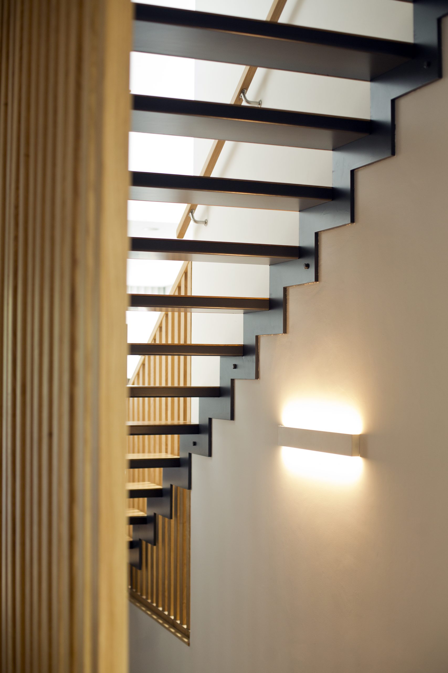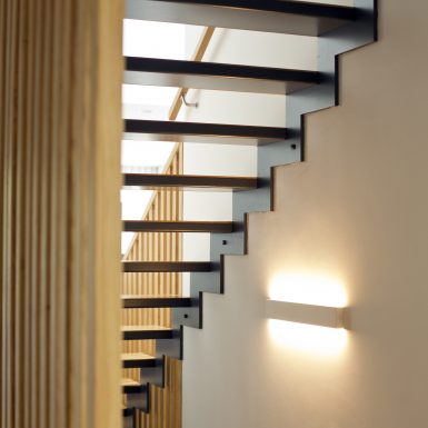 Se trata de una parcela con un acusado desnivel, conformada por potentes lajas de piedra, cuyo acceso se produce por la cota inferior. A partir del análisis topográfico se adopta la primera decisión estratégica: situar la vivienda en la planta primera y el garaje en planta baja. De este modo, el edificio se proyecta de manera escalonada, adaptándose al perfil natural del terreno y apoyándose sobre la roca, generando una secuencia de espacios exteriores a diferentes niveles. El objetivo es maximizar la superficie útil de parcela y favorecer su disfrute.
